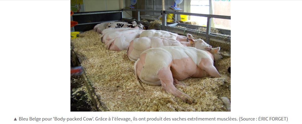 Selon la légende qui l'accompagne, la photographie authentique montre des vaches Blanc bleu belge, une race bovine "à viande" qui "se distingue par son hypertrophie musculaire", comme l'explique le site d'AgroParisTech.