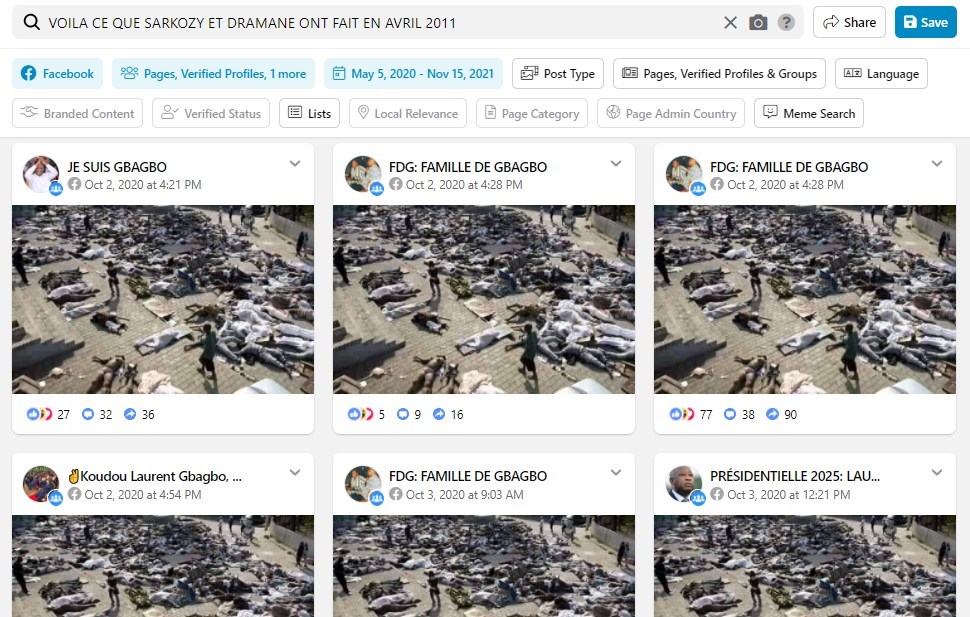 Cette publication a été partagée plus de 1.500 fois depuis septembre 2020 sur Facebook en Côte d'Ivoire. Elle avait massivement circulé dès cette date dans des groupes pro-Gbgagbo, comme le montre l'outil d'analyse des réseaux sociaux Crowdtangle: