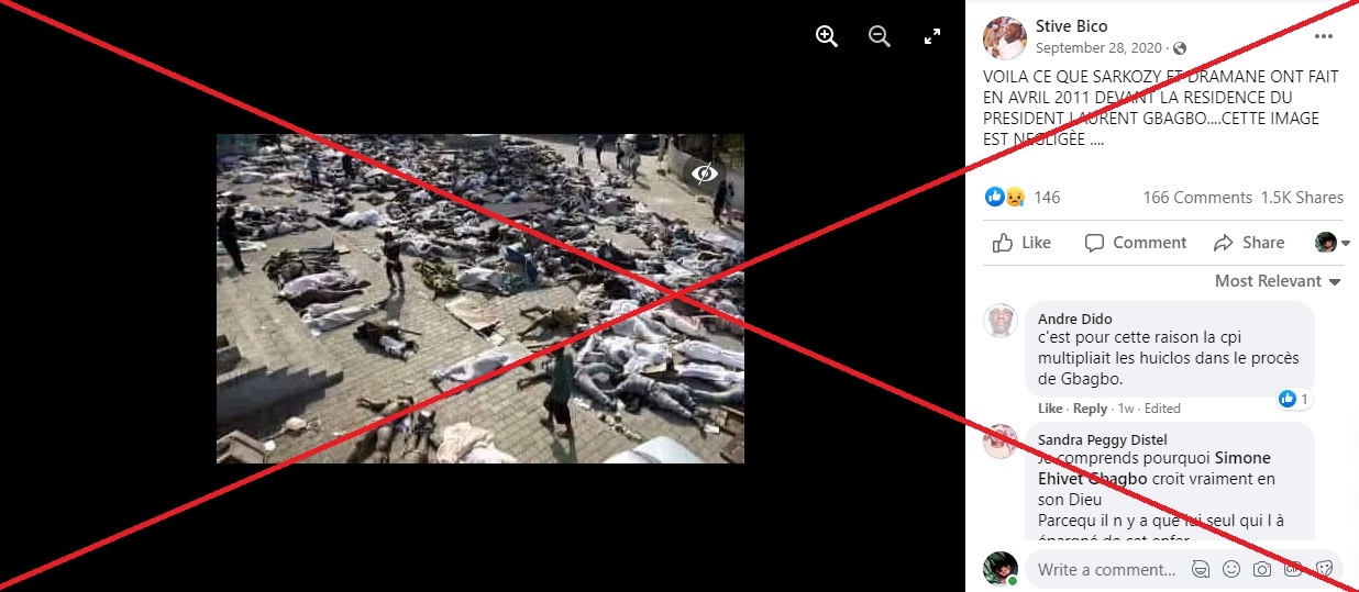 Des dizaines et des dizaines de cadavres sont alignés sur les pavés. Entre eux, de rares survivants semblent s'affairer. Selon l'internaute qui la publie, cette image capture les conséquences des bombardements orchestrés par "Sarkozy et Dramane [Alassane Ouattara, ndlr]" en avril 2011 visant la "résidence du président Laurent Gbagbo", qui refusait à l'époque de quitter le pouvoir ivoirien malgré sa défaite aux élections.