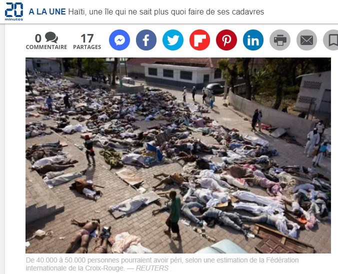 Une recherche d'images inversées sur le moteur de recherches Google permet de la retrouver en illustration d'un article du quotidien gratuit 20Minutes du 16 janvier 2010 intitulé "Haïti, une île qui ne sait plus quoi faire de ses cadavres". Il raconte le désarroi des Haïtiens submergés par le nombre de cadavres des victimes du séisme du 12 janvier 2010.