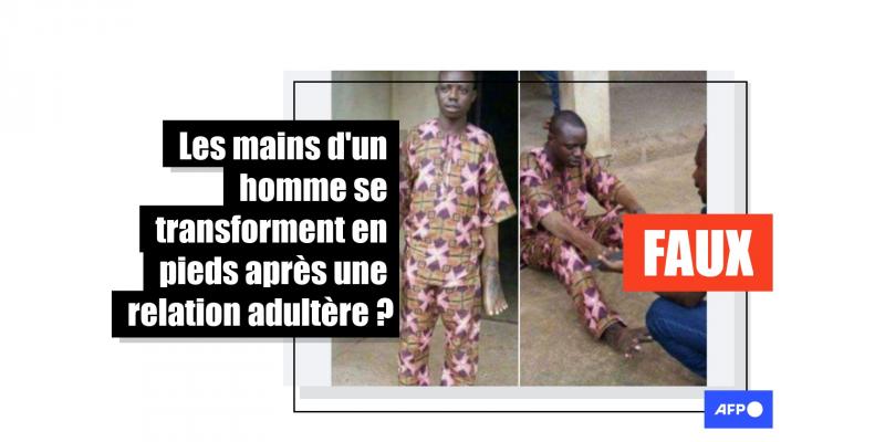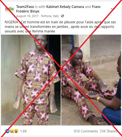 Au-dessus des photos, quelques mots pour soi-disant expliquer cette transformation. "Nigeria. Cet homme est en train de pleurer (...) après que ses mains se soient transformées en jambes, après avoir eu des rapports sexuels avec une femme mariée".