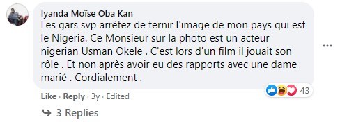 Une recherche d'images inversée sur plusieurs moteurs de recherches permet de l'identifier: il s'agit en réalité de l'acteur et comédien nigérian Tunde Usman, connu sous le nom d'Okele, comme suggéré par un internaute dans les commentaires sous la publication virale, ainsi que sur ce forum nigérian.