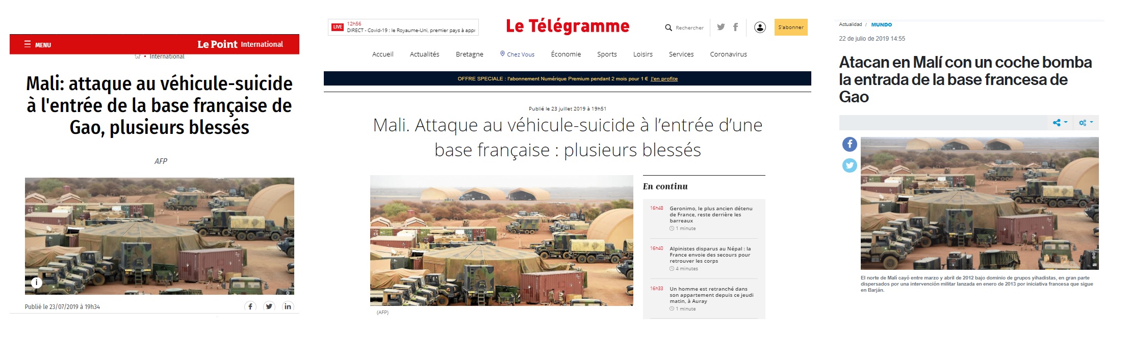 Mais cette image a été manipulée: une recherche d'images inversée sur le moteur de recherche Google Images permet de remonter à plusieurs articles (1, 2, 3) -reprenant des dépêches de l'AFP- illustrés par le cliché, à propos d'une attaque au véhicule-suicide sur la base militaire française de Gao, dans le nord-est du Mali, en juillet 2019.