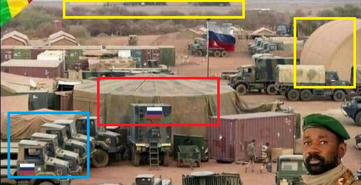 Sur ce campement flotte un drapeau russe, aux trois bandes horizontales blanche-bleue-rouge caractéristiques. Deux autres figurent à l'arrière et sur le flanc de deux camions. Selon les internautes qui la partagent, il s'agit là de la "première base sur le sol malien" du groupe paramilitaire russe Wagner. Certains la localisent même plus précisément "dans le nord du pays".