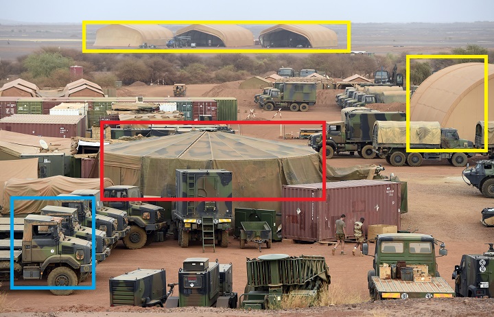 La tente circulaire (rectangle rouge), les véhicules (rectangle bleu) et leurs positionnements, et les différents hangars à l'arrière-plan (rectangles jaunes) sont en tous points identiques dans les deux images.