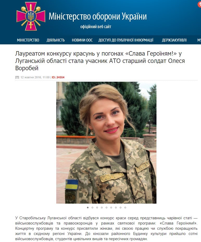 En faisant une recherche inversée d'image sur Google - voir ici comment faire - l'AFP Factuel a retrouvé la photo partagée dans les publications ici vérifiées sur le site du ministère de la Défense ukrainien. Le titre de l'article indique que cette femme s'appelle Olesya Vorobey (ОÐ"еÑÑ Ð'оробей, en ukrainien) et qu'elle a gagné en octobre 2016 un concours de beauté appelé "Gloire aux héroïnes".