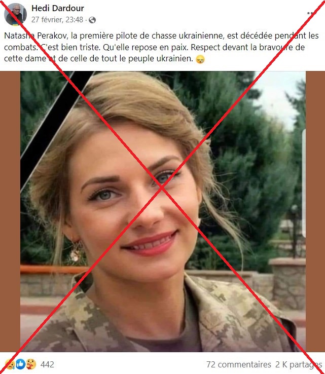 La photo montre une jeune femme, maquillée et en treillis militaire. Selon cette publication, partagée plus de 2 000 fois depuis le 27 février 2022, il s'agit de "Natasha Perakov, la première pilote de chasse ukrainienne, décédée pendant les combats".