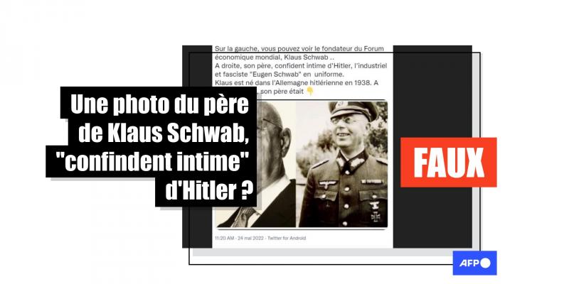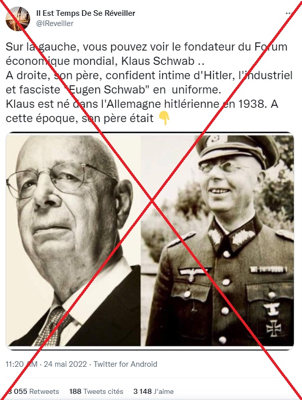 "Sur la gauche, vous pouvez voir le fondateur du Forum économique mondial, Klaus Schwab...A droite, son père, confident intime d'Hitler, l'industriel et fasciste "Eugen Schwab" en uniforme", écrit l'auteur d'un tweet, relayé plus de 3 000 fois depuis le 24 mai 2022.