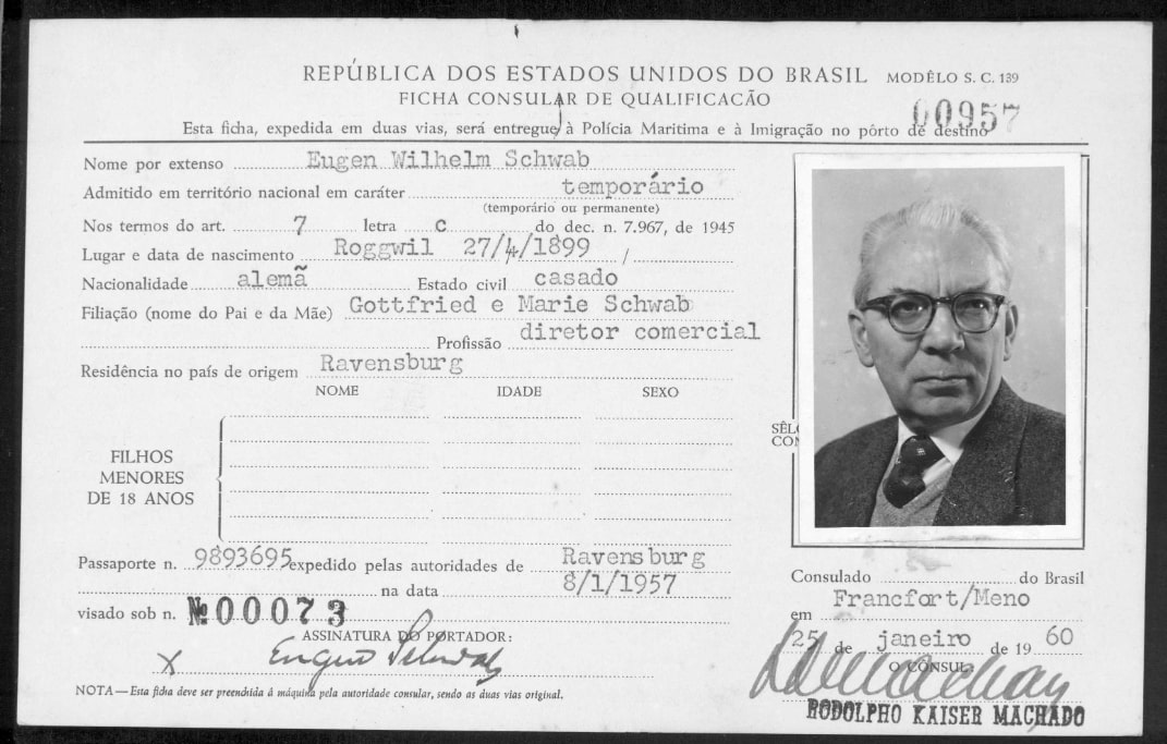 Par ailleurs, plusieurs articles de vérification publiés par d'autres médias mentionnent également Walter Dybilasz. Parmi eux, les articles publiés par DPA, Ellinika Hoaxes et la Republica Verificador utilisent une photo d'Eugen Schwab publiée sur le site Family Search. Il s'agit de la photo d'un ancien visa temporaire pour le Brésil, daté de 1960.