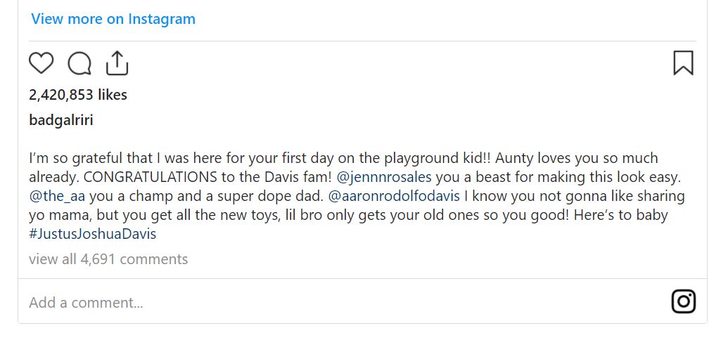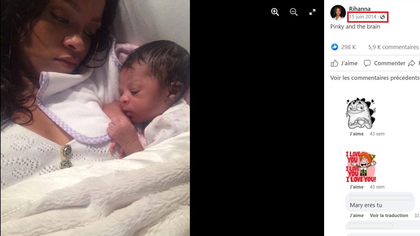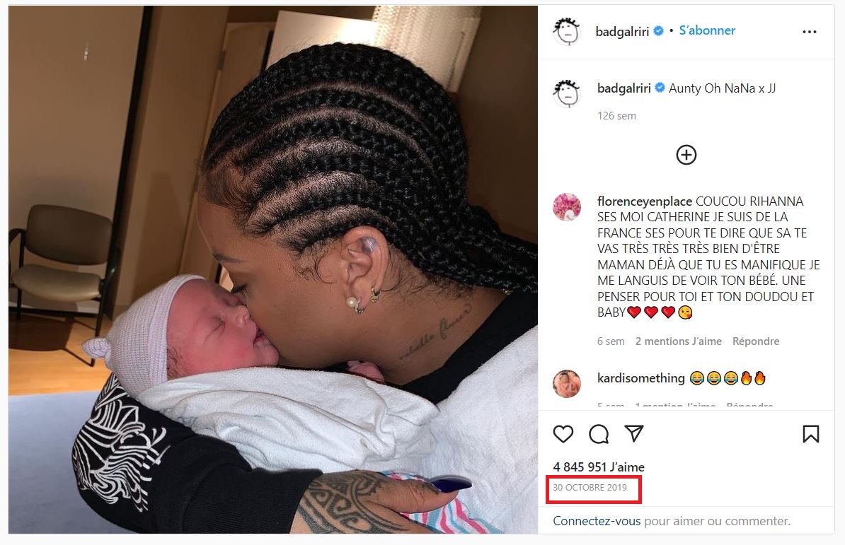 La photo figure parmi une série de clichés de Rihanna avec le nourrisson, tous publiés le même jour. Sous une autre photo de cette série, elle écrit en anglais: "Je suis si heureuse d'avoir été là pour ton premier jour sur terre, petit ! Tata t'aime déjà tellement. Bravo à la famille Davis ! @jennrosales [Jennifer Rosales], tu es incroyable, tu réussis à faire paraitre tout ça facile !"