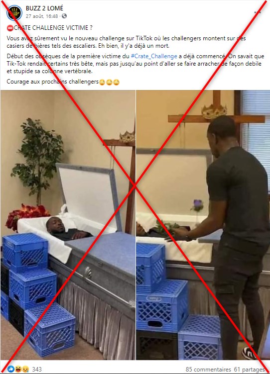 Une photo partagée plusieurs centaines de fois en Afrique depuis fin août prétend montrer la première victime du "crate challenge" dans son cercueil. Il aurait perdu la vie en relevant le défi de ce nouveau challenge populaire sur le réseau social Tik Tok, qui consiste à se filmer en train d'escalader une pyramide de caisses en plastique sans tomber. C'est faux, il s'agit d'une image extraite d'un sketch de l'humoriste américain Desi Banks. Dans la vidéo, il dénonce justement les dérives de cette nouvelle mode dangereuse.