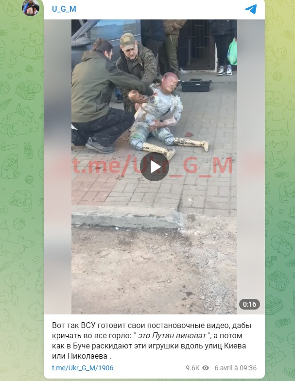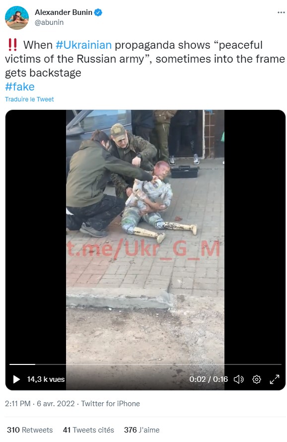 Le même jour, un influent compte Twitter russophone relayait la même vidéo tout en affirmant en anglais : "Quand la propagande ukrainienne montre "des victimes innocentes de l'armée russe", mais que les coulisses apparaissent dans le champ de la caméra".