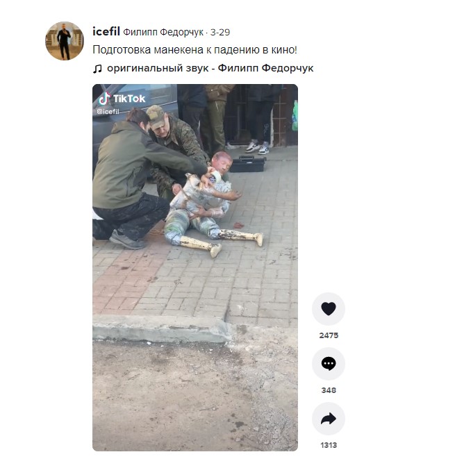 A l'origine, cette vidéo de 16 secondes a été mise en ligne le 29 mars 2022 sur TikTok par le comédien russe Philippe Fedortchouk, avec la légende suivante : "Préparation d’un mannequin pour une chute au cinéma".