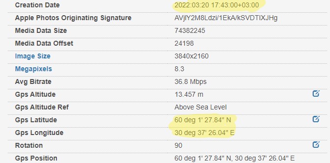 Les métadonnées de la vidéo d'origine, que l'AFP a pu consulter sur le site "Metadata2go", confirment la date de ces images filmées à l'iPhone 11 Pro Max : le 20 mars, à 17h43, heure de Moscou (16h43 à l'heure de Paris).