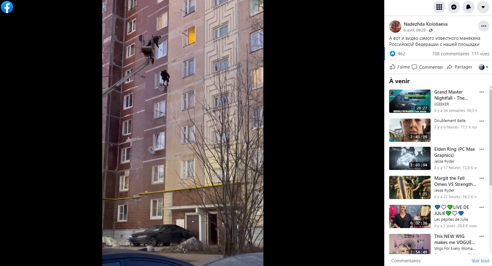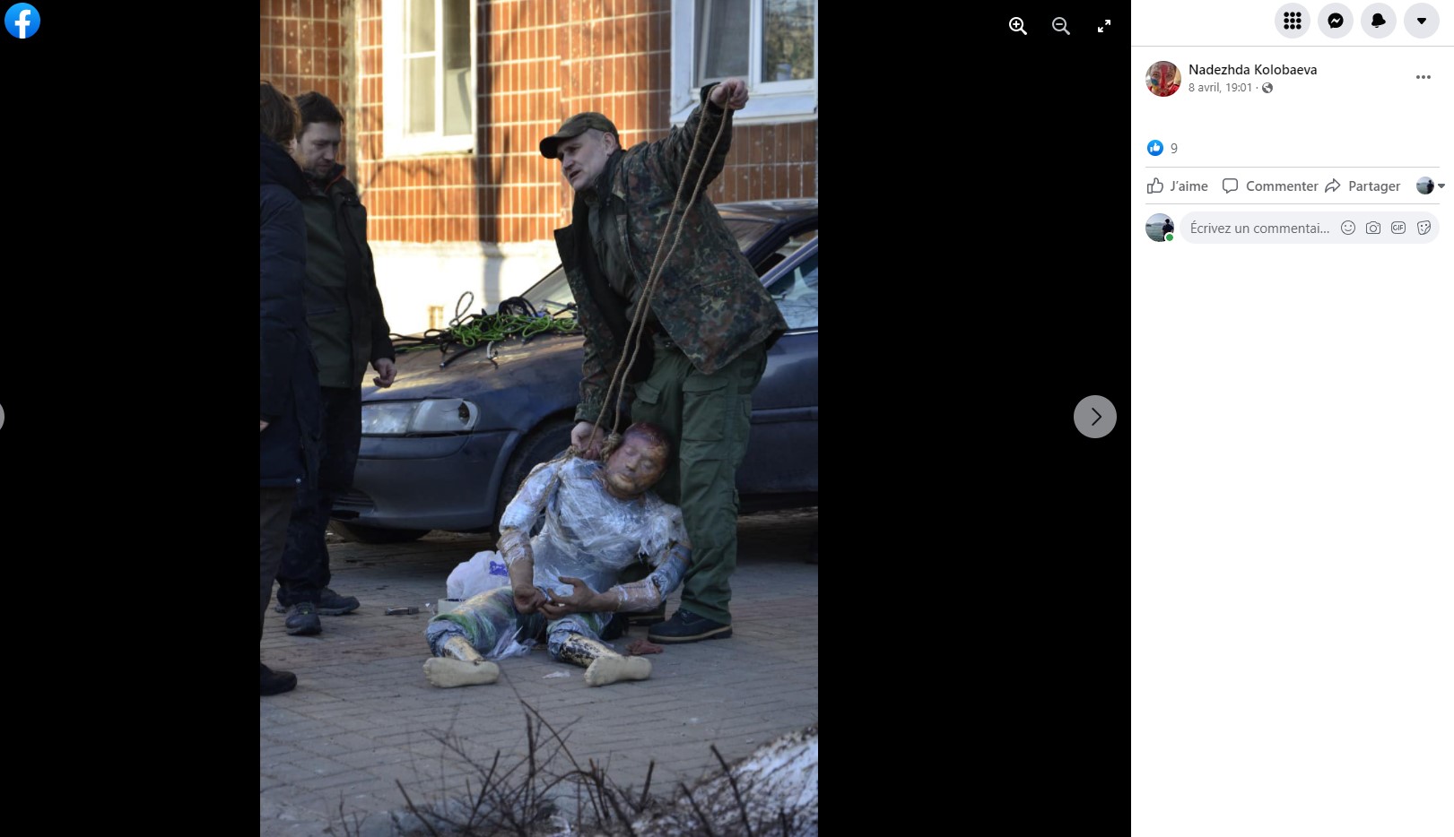 Une vidéo montrant deux hommes manipuler un mannequin au visage particulièrement réaliste est partagée des milliers de fois sur Facebook et sur Twitter. Elle montrerait des soldats ukrainiens "en train de préparer un cadavre à Boutcha", la ville où ont été découverts des dizaines de cadavres début avril, après le départ des forces russes. Si la Russie a constamment nié toute responsabilité dans ce massacre et dénoncé une "mise en scène" de l'Ukraine, cette vidéo n'a pas été prise à Boutcha. Elle a été filmée lors du tournage d'une série russe à Vsevolojsk, près de Saint-Pétersbourg, le 20 mars 2022, comme le confirment plusieurs témoins à l'AFP, dont l'auteur de la vidéo, ainsi que les métadonnées du fichier original.