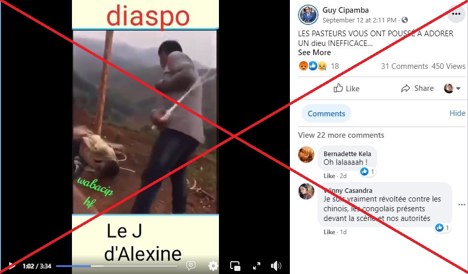 Une vidéo partagée plus de 220 fois depuis le 12 septembre montre, selon les internautes qui la font circuler, un Chinois fouettant un Congolais, dans une exploitation minière en République démocratique du Congo. Certains auteurs de ces publications, indignés, s'emportent contre le gouvernement congolais, tandis que d'autres dénoncent une nouvelle "colonisation", dans un contexte de tensions sino-congolaises. Attention: cette scène s'est déroulée fin août au Rwanda, et non en RDC.