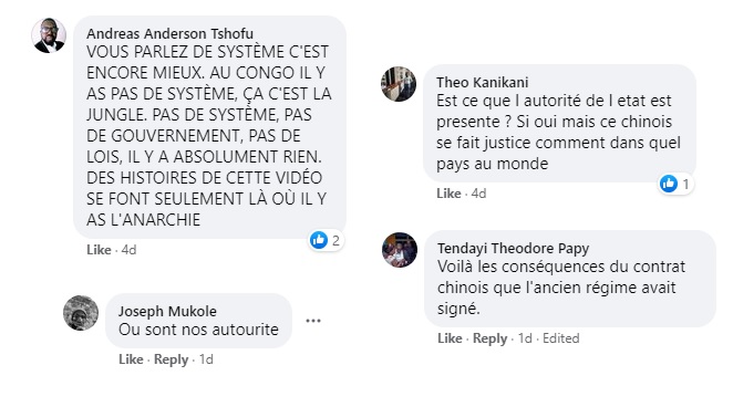 D'autres s'en prennent au gouvernement du président congolais, Félix Tshisekedi, et dénoncent une "jungle" sans foi ni loi. Un autre affirme que la scène visible dans cette vidéo serait une des "conséquences du contrat chinois que l'ancien régime avait signé".