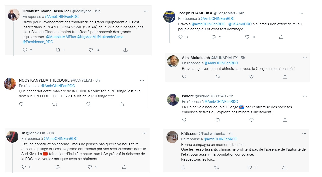 Le 17 septembre, un tweet de l'ambassade sur la construction d'un centre culturel a suscité des commentaires mitigés, allant de "bravo à @AmbCHINEenRDC, @USAmbDRC n'a jamais rien offert de tel au peuple", à "cette construction énorme ne va pas nous faire oublier le pillage et l'esclavagisme entretenus par vos ressortissants".