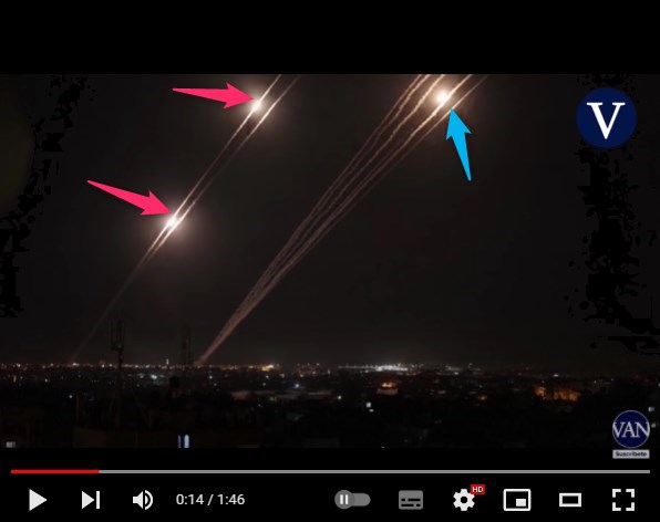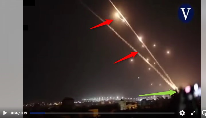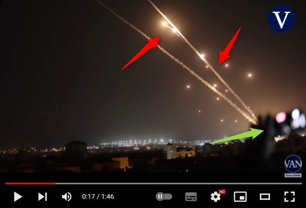 Et à la 17ème seconde, on voit à nouveau les mêmes tirs de missiles (flèches rouges), ainsi que les mains d'une personne tenant un téléphone portable qui filme la scène (flèche verte).