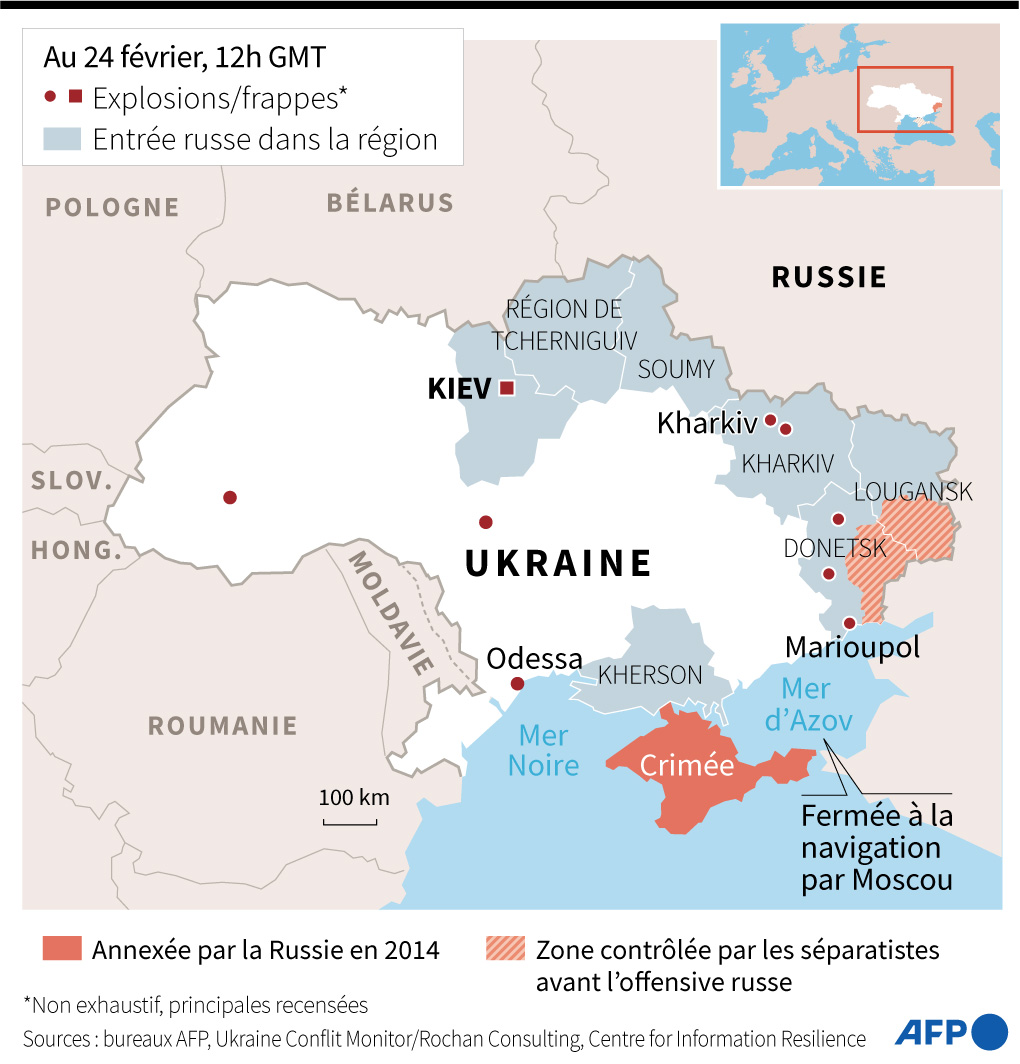 Peu après, une série d'explosions étaient entendues à Kiev, Kramatorsk, ville de l'est qui sert de quartier-général à l'armée ukrainienne, à Kharkiv (est), deuxième ville du pays, à Odessa (sud), sur la mer Noire, et à Marioupol, principal port de l'est du pays.