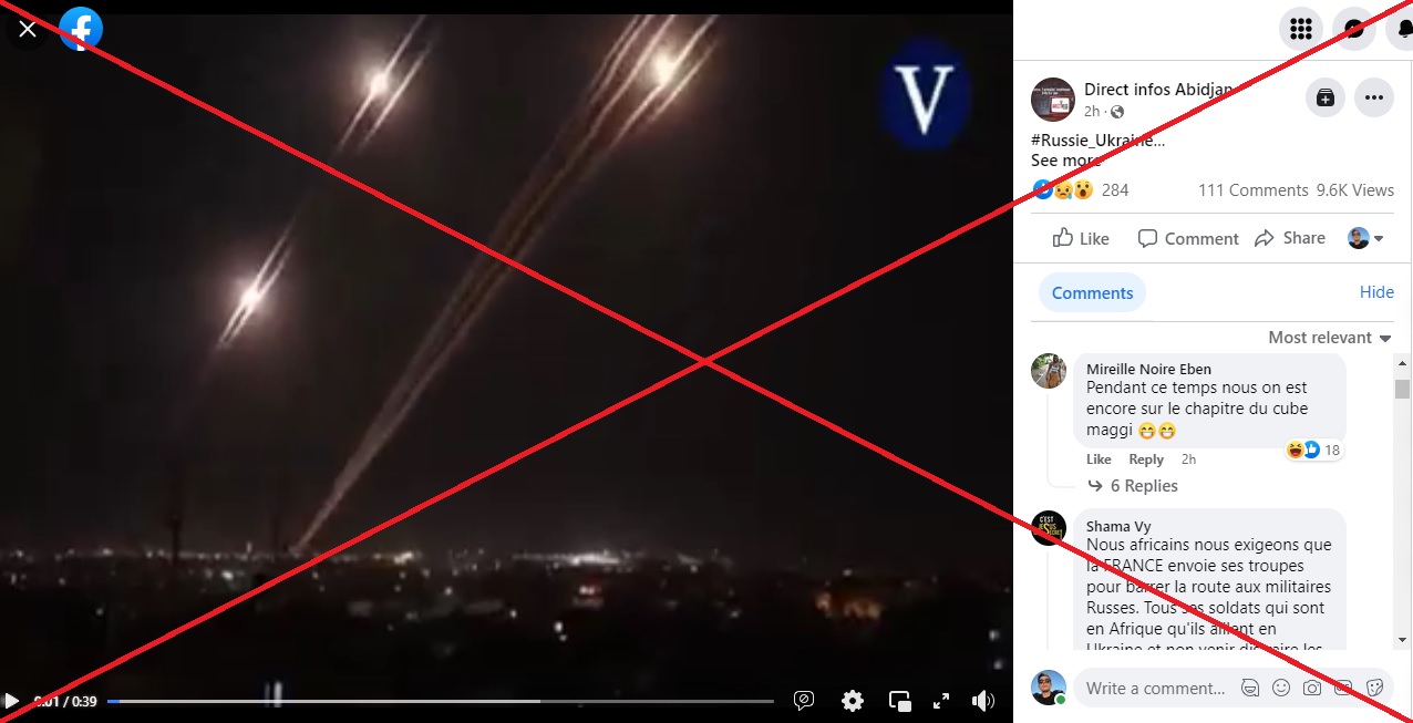 Quelques heures après que le président russe Vladimir Poutine a lancé une invasion de l'Ukraine à l'aube du 24 février, une vidéo montrant des tirs nocturnes de missiles circulait massivement sur Facebook en Côte d'Ivoire, avec cette légende : "la Russie a attaqué cette nuit la capitale Kiev et 4 autres villes" ukrainiennes. Mais attention: cette vidéo montre en réalité des tirs de missiles depuis Gaza vers Israël en mai 2021.