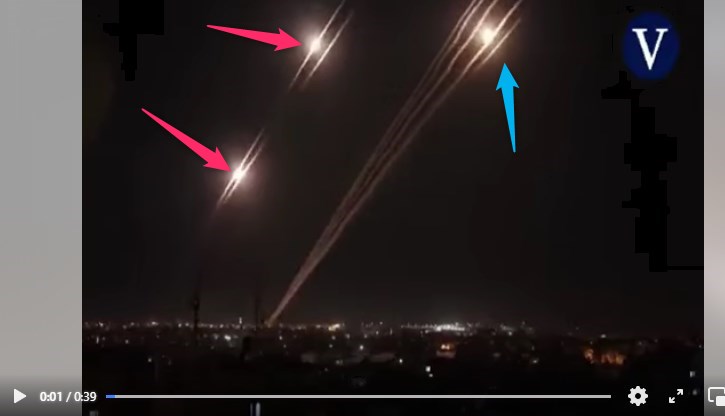 Synchroniser les deux vidéos permet de confirmer qu'il s'agit bien de la même scène : on voit à la 14e seconde de la vidéo du quotidien espagnol les mêmes missiles tirés (flèches rouges et bleues).