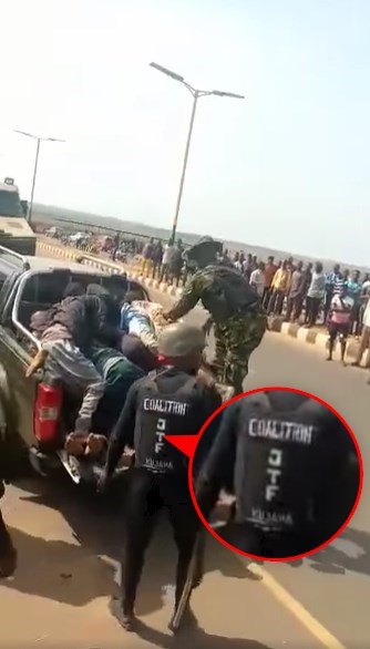Premièrement, à 1 minute et onze secondes, on aperçoit un homme vêtu d'un gilet pare-balles noir sur lequel est inscrit en blanc "Coalition JTF Kujama". En cherchant ces termes dans Google, on tombe sur une page Facebook d'un groupe de sécurité, Coalition JTF, actif à Kaduna et dans ses environs.