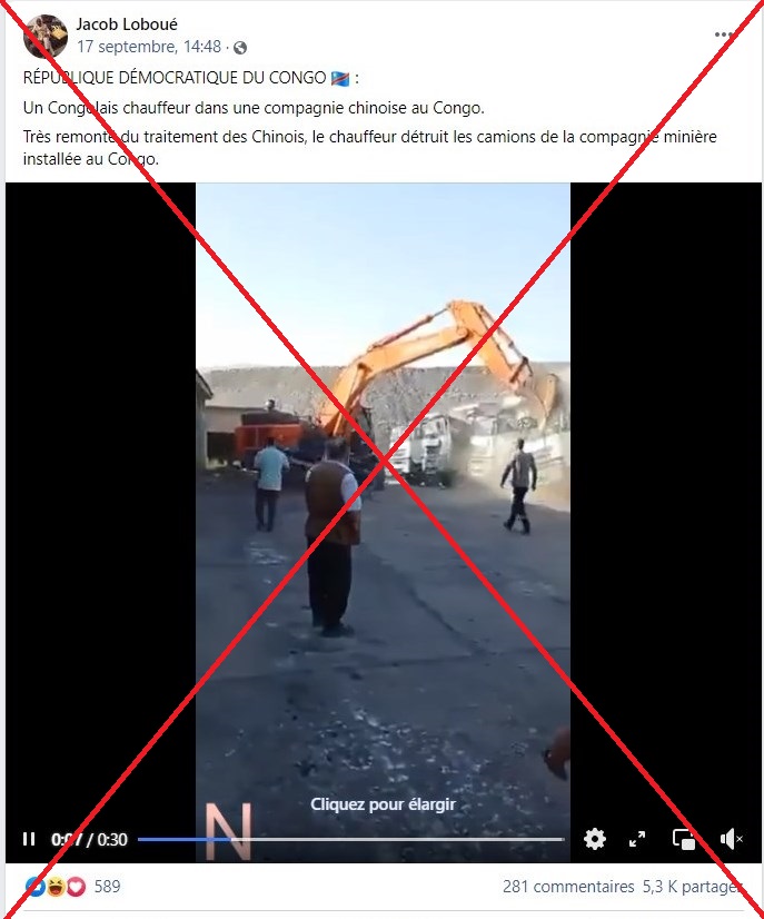 Une vidéo devenue virale sur les réseaux sociaux en République démocratique du Congo (RDC) est censée montrer la destruction de camions d'une entreprise chinoise par un ouvrier congolais en colère. Cela intervient alors que grandit un sentiment anti-chinois dans le pays. Mais cette séquence, qui cumule plusieurs milliers de partages depuis le 15 septembre 2021, a en réalité été filmée en Turquie.