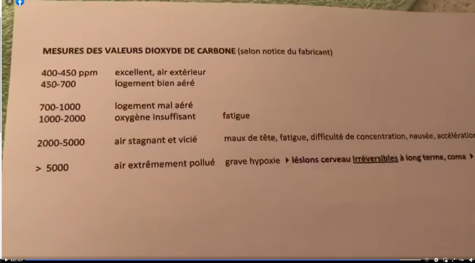 A la fin de la vidéo, la femme montre un document imprimé, issu selon elle de la notice du fabricant, sur lequel apparaissent plusieurs valeurs de concentration en dioxyde de carbone et leurs conséquences supposées pour la santé. A une concentration supérieure à 5 000 ppm, l'air est considéré comme "extrêmement pollué" et peut provoquer une "grave hypoxie" - un dangereux manque d'oxygène - et des "lésions (au) cerveau irréversibles à long terme", voire un "coma", selon ce document.