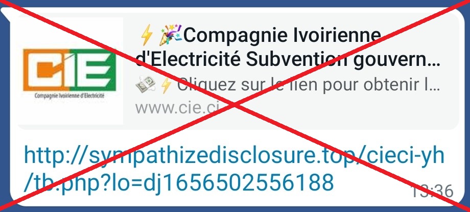 Premier indice : les adresses web ne correspondent pas à celles des sites internet officiels des entreprises. C’est le cas pour l'annonce attribuée à la Compagnie Ivoirienne d’Electricité (CIE). Alors que l'adresse du site officiel de l’entreprise est www.cie.ci, l'URL contenue dans l’annonce n'est qu'une succession de lettres et de chiffres sans aucun lien avec l’identité de la compagnie. Il faut redoubler de vigilance car le site frauduleux ressemble beaucoup au site officiel. Allez d'abord vérifier via un moteur de recherche à quoi doit ressembler l'URL du site officiel.