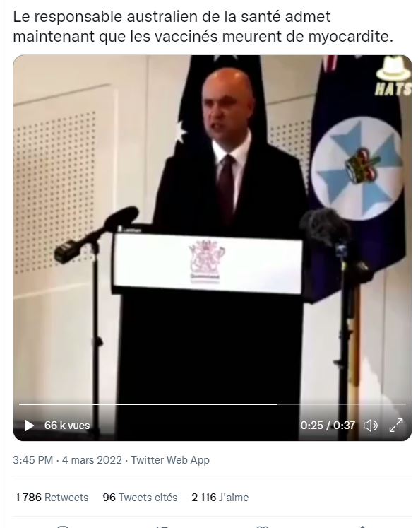 "Le responsable australien de la santé admet maintenant que les vaccinés meurent de myocardite", prétendent les auteurs de plusieurs tweets et publications Facebook. La vidéo a également été partagée avec la même légende en anglais.
