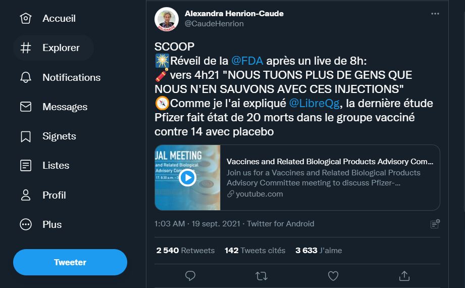 A l'origine de ces affirmations ? Un tweet de la généticienne Alexandra Henrion-Caude, diffusé sur son compte le 19 septembre 2021 : "Réveil de la FDA après un live de 8h. Vers 4h21 'nous tuons plus de gens que nous n'en sauvons avec ces injections", assène l'ex-directrice de recherche à l’Inserm (Institut national de la santé et de la recherche médicale).