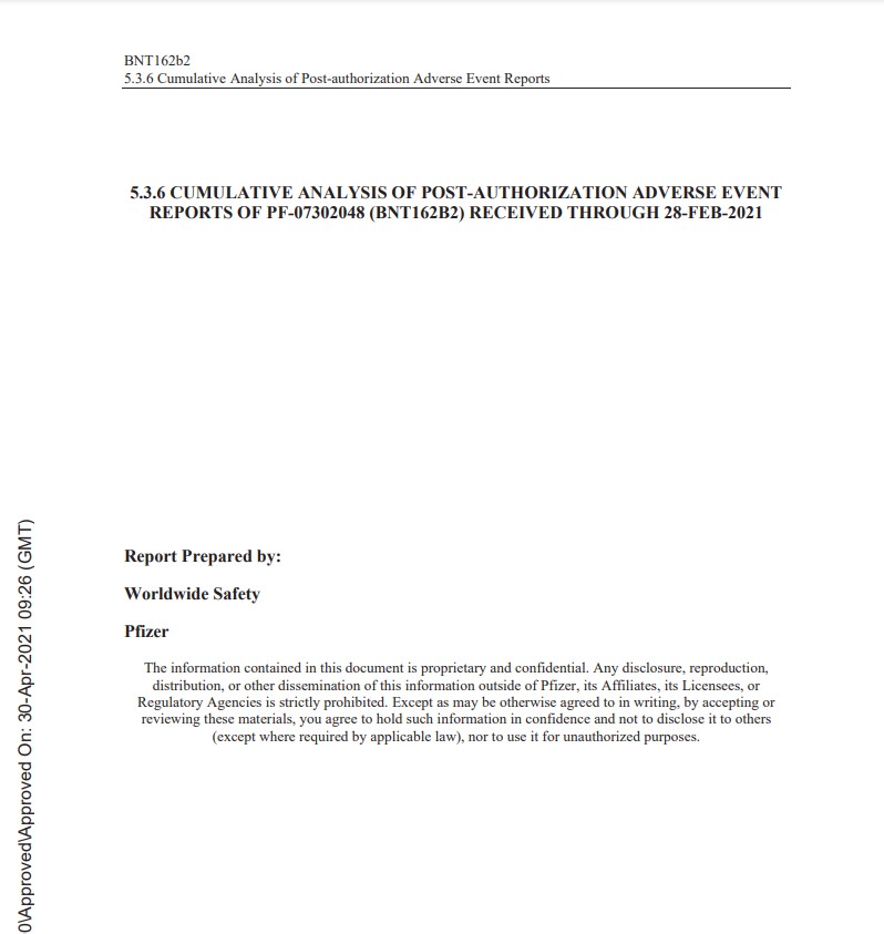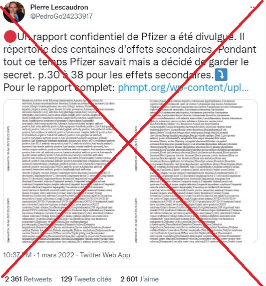 "Un rapport confidentiel de Pfizer a été divulgué. Il répertorie des centaines d'effets secondaires", "Pfizer vient de déposer un compte-rendu des effets secondaires de la vaccination, hé bien, en tout 1.291 effets secondaires, un total de 8 pages!"...