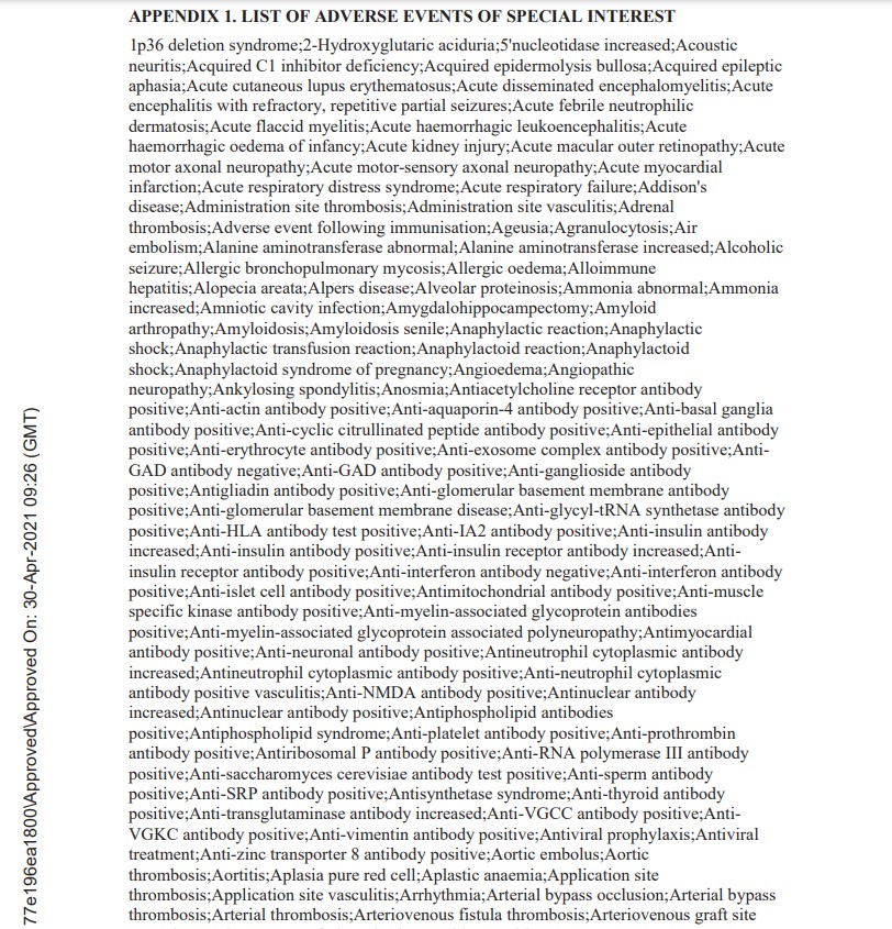 Le rapport se poursuit enfin, à partir de la page 30, avec une annexe listant ces AESI. Ces événements indésirables d'intérêt particulier sont à différencier des effets indésirables puisque, contrairement à eux, leur lien de causalité avec le vaccin n'est pas établi.
