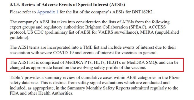 Concrètement, l'annexe du document de Pfizer relative aux AESI reprend une multitude d'entrées figurant dans le dictionnaire MedDRA de codage des termes médicaux, comme le précise sa page 16.