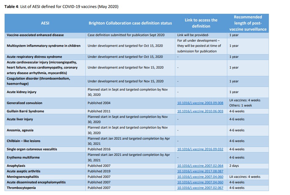 En outre, ainsi que le souligne Aurélie Grandvuillemin, "cette annexe est particulièrement longue car elle compile tous les termes que Pfizer a considéré comme des AESI, liste qui regroupe elle-même plusieurs listes, bien au-delà des listes plus courtes telles que celle proposée initialement par l'OMS". Cette dernière, en date de mai 2020 et relative aux "AESI définis pour les vaccins contre le Covid-19", tient en effet sur une seule page, sous la forme d'un tableau comportant une quinzaine d'entrées.