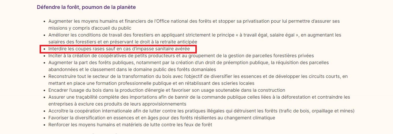 Dans une proposition de loi déposée en 2020, l’élue du Val-de-Marne prône plus précisément une "interdiction des coupes rases" sur "une surface de plus de 2 hectares (20.000 m²)", sauf en cas "d’impasse sanitaire", et une autorisation préalable pour le faire sur une surface comprise entre "0,5 hectare" (peu ou prou la superficie d’un terrain de football, NDLR), et "2 hectares". Ces superficies "sont toujours d'actualité", ont confirmé séparément à l'AFP Mathilde Panot et Clémence Guetté, candidate LFI dans le Val-de-Marne, et coordinatrice du programme de La France insoumise.