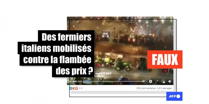 Visionnée plus de 50.000 fois sur la page d'un groupe Facebook qui se fait le relai d'images de mobilisations populaires, la publication prétend dévoiler les images d'agriculteurs italiens, mobilisés en nombre contre la baisse du pouvoir d'achat.
