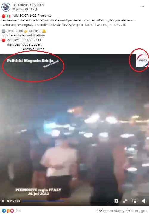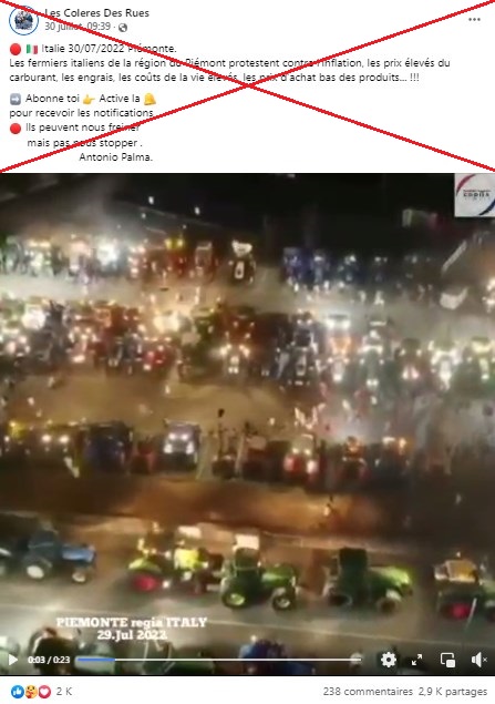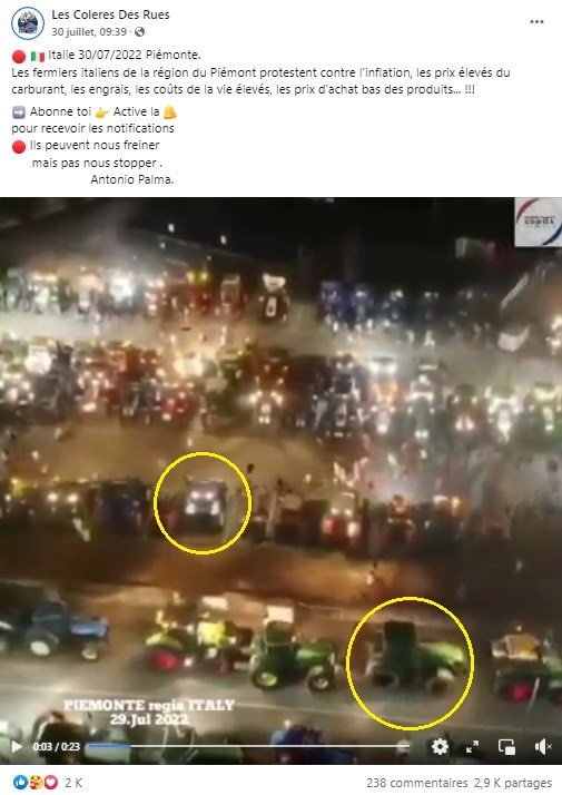 "Les fermiers italiens de la région du Piémont protestent contre l'inflation, les prix élevés du carburant, les engrais, les coûts de la vie élevés, les prix d'achat bas des produits... !!!", est-il affirmé dans la légende qui accompagne la publication, partagée près de 3.000 fois depuis le 30 juillet 2022.