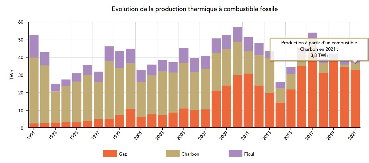 Entre 2020 et 2021, la production issue du charbon en France a ainsi plus que doublé, passant de 1,4 à 3,8 TWh. Pour couvrir le pic de consommation hivernale, le gouvernement a par ailleurs relevé temporairement le plafond légal de production issue du charbon, qui avait été fixé par la loi énergie-climat de 2019.