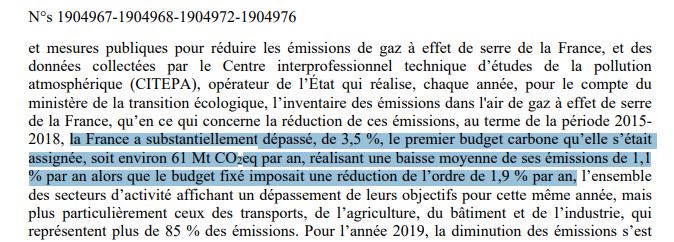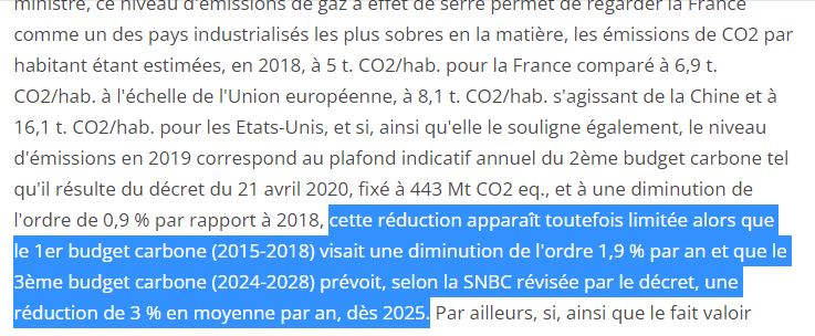 Ainsi, si le Conseil d'Etat reconnaît, dans sa décision, que "le niveau d’émissions mesuré en 2019 respecte l’objectif annuel fixé [de 1,5%] pour la période 2019-2023", il relève que "la baisse des émissions observée, de 0,9 %, apparaît limitée par rapport aux objectifs de réduction visés pour la précédente période (2015-2018), qui étaient de 1,9 % par an et par rapport aux objectifs fixés pour la période suivante (2024-2028), qui sont de 3 % par an."