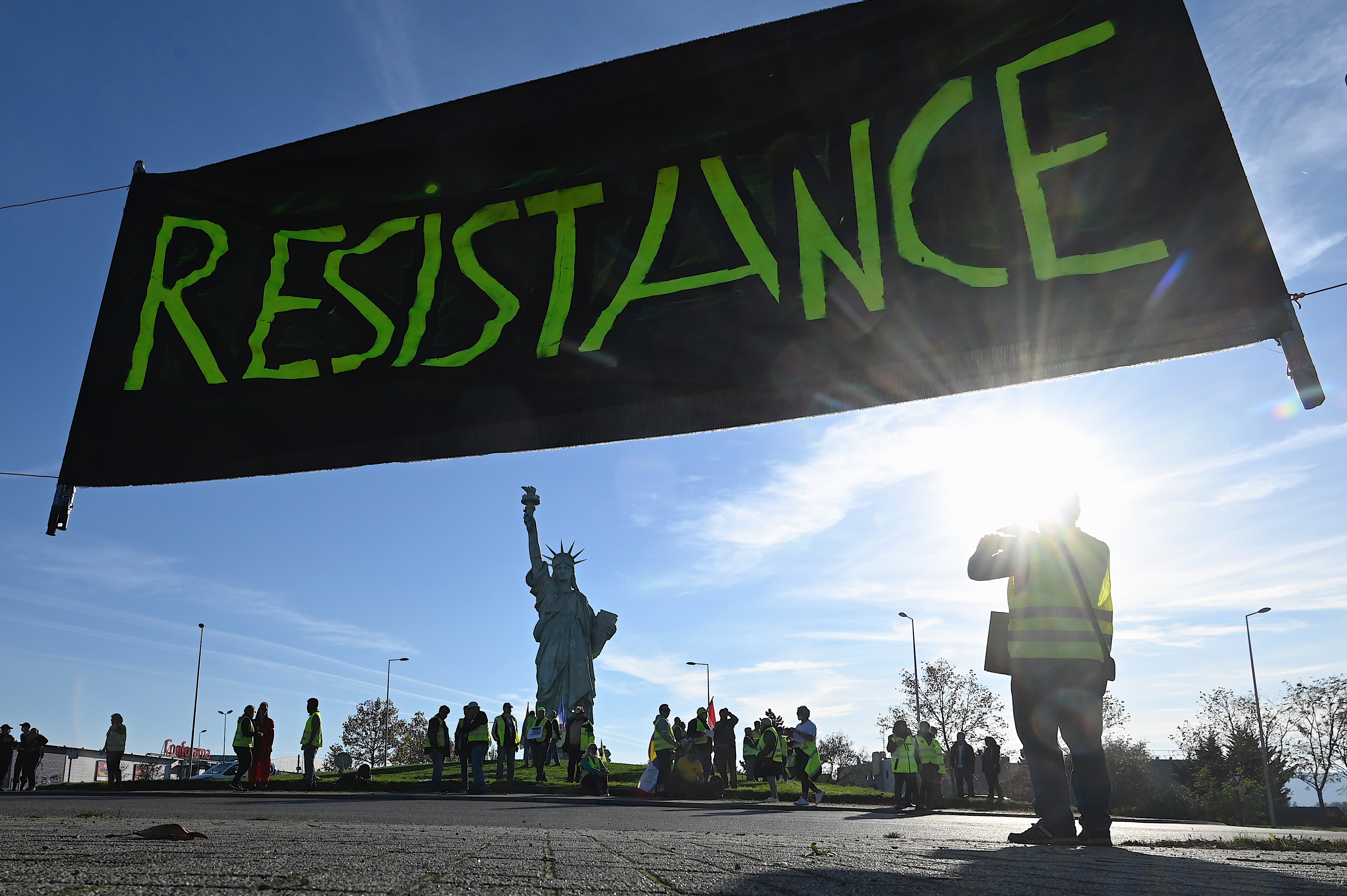 Des "Gilets jaunes" manifestent le 14 novembre 2020 ) Colmar, près du rond-point sur lequel figure une réplique de la statue de la liberté. ( AFP / SEBASTIEN BOZON)