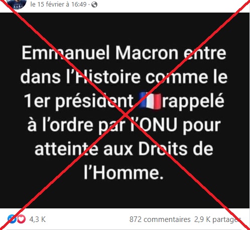"Emmanuel Macron entre dans l'Histoire comme le 1er président français rappelé à l'ordre par l'ONU pour atteinte aux droits de l'homme", prétend une publication Facebook partagée près de 3.000 fois depuis le 15 février.