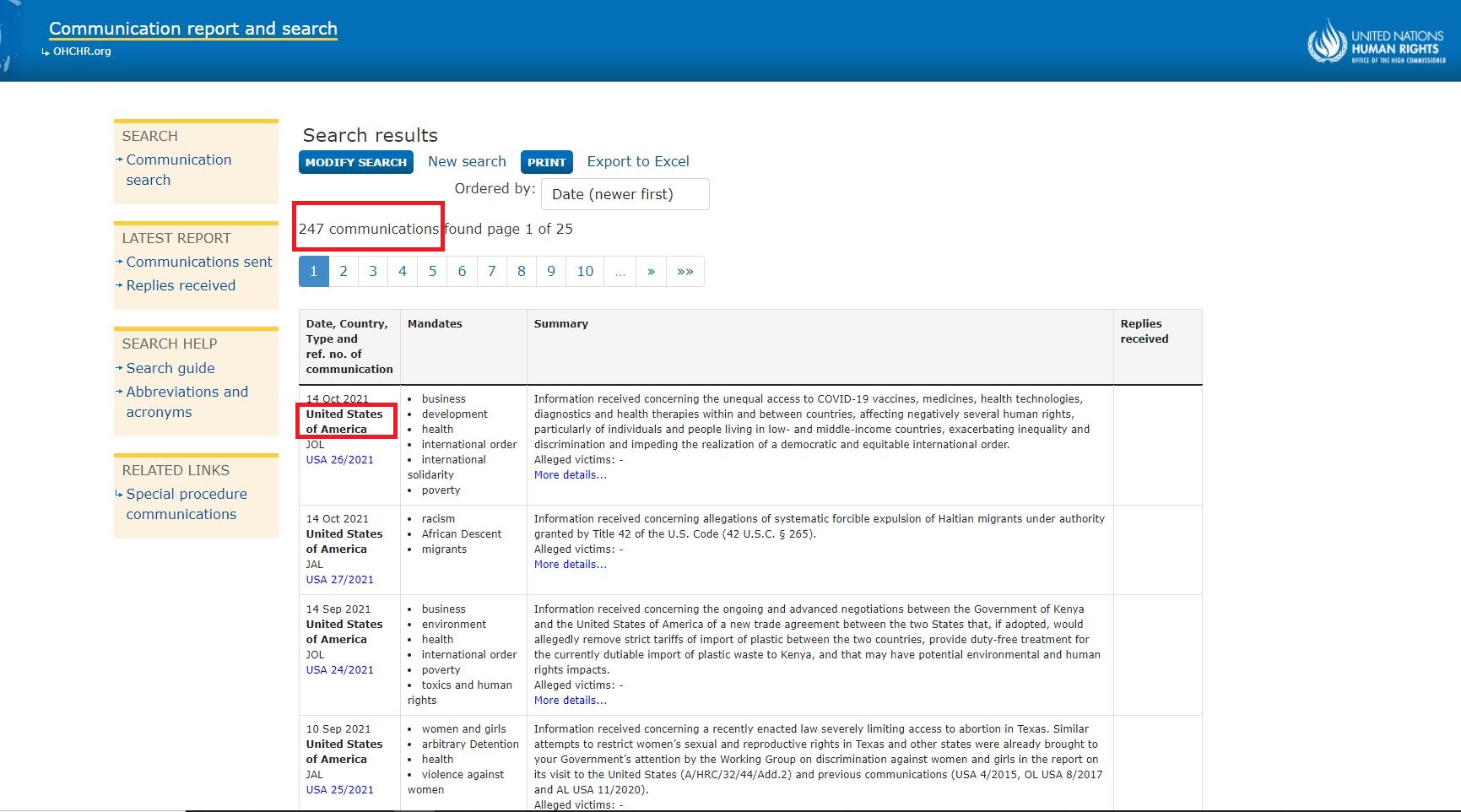Parmi une soixantaine de rapports répertoriés depuis 2010 (l'outil ne permet pas de recherches antérieures), on retrouve des recommandations liées notamment aux thèmes généraux du traitement des migrants et des minorités, aux conditions d'emprisonnement ou au racisme. Les rapporteurs font généralement part de "préoccupations", ou de "propositions" et "commentaires" et "rappellent" aux Etats l'existence de traités internationaux, se montrant plus ou moins fermes dans ces recommandations.