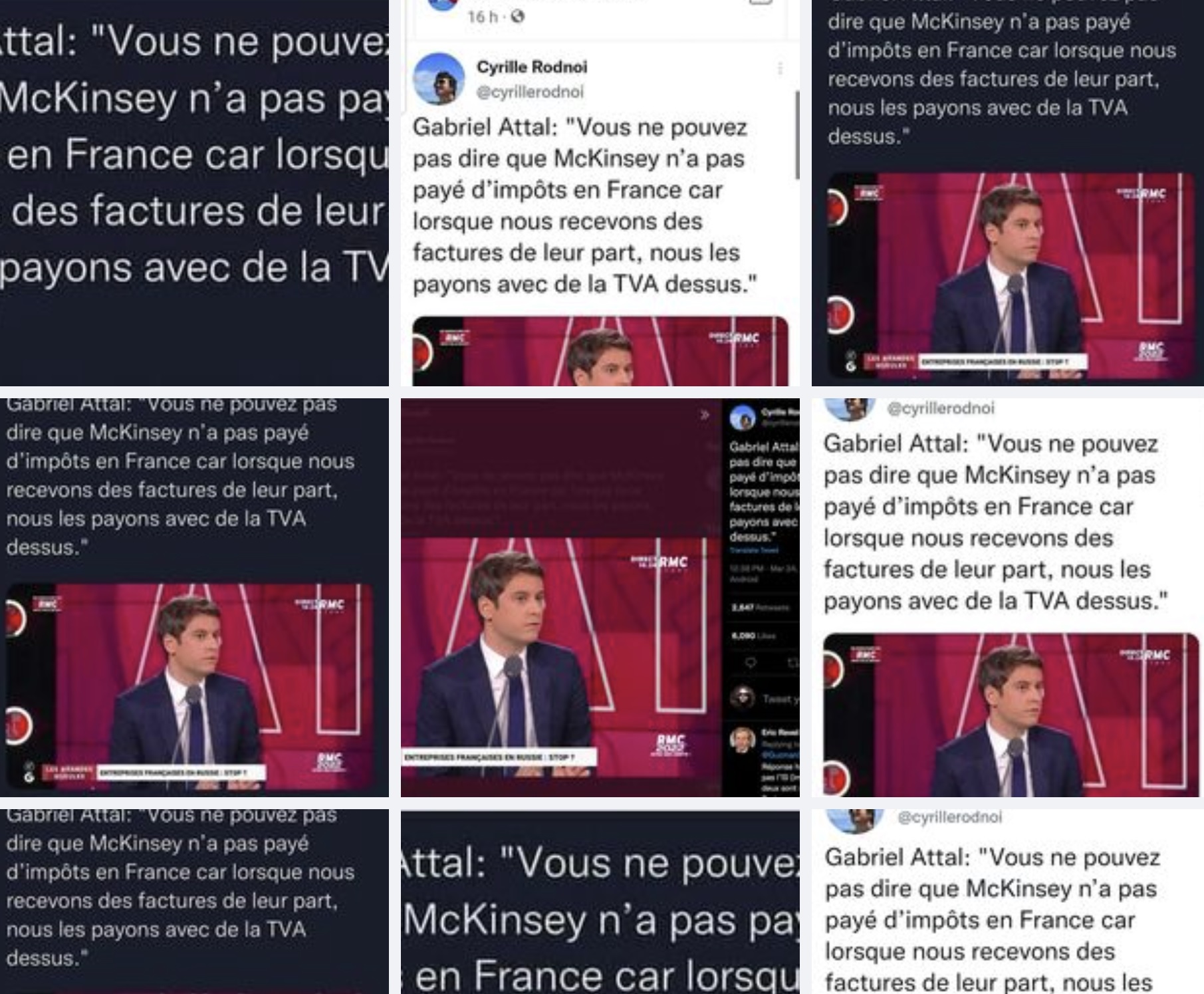 Massivement relayée sur les réseaux sociaux, une publication prête à Gabriel Attal une déclaration selon laquelle il est impossible que McKinsey n'ait "pas payé d'impôts en France", dans la mesure où le gouvernement payait "avec de la TVA" les factures envoyées par le cabinet de conseil. Il s'agit cependant d'une infox : interrogé à plusieurs reprises sur le recours aux consultants de l'Etat, le porte-parole du gouvernement n'a jamais tenu de tels propos. Si elle a été prise au sérieux par de nombreux internautes, cette déclaration émane en réalité d'un compte Twitter ouvertement parodique, habitué à détourner des prises de paroles de responsables politiques.