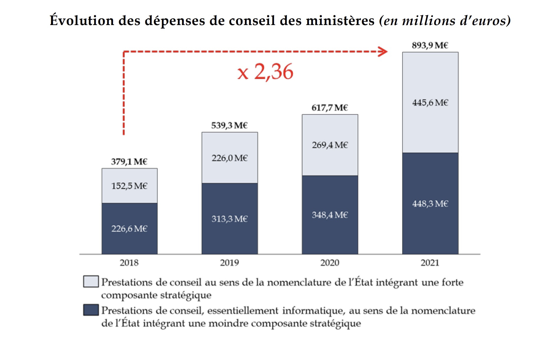 Ainsi, en 2021, "les dépenses de conseil de l’État au sens large ont dépassé le milliard d’euros, dont 893,9 millions pour les ministères et 171,9 millions pour un échantillon de 44 opérateur", selon cette commission.