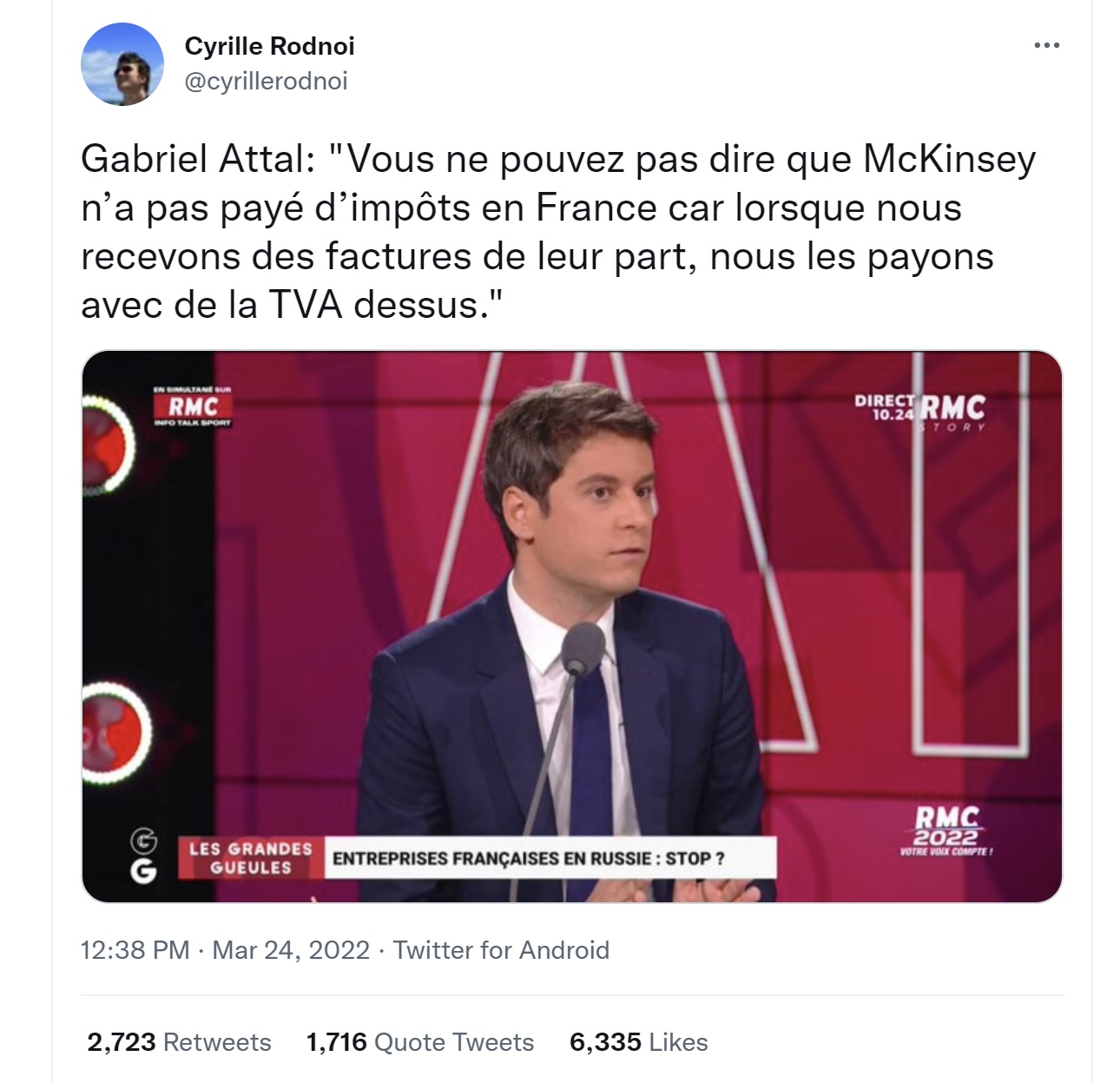 J’ai écouté @GabrielAttal qui a dit sue mckinsey payait ses impôts en France puisqu’il payait la TVA ! j’ai décidé d’arrêter de payer l’impôt sur les sociétés et j’envisage de recruter mckinsey pour m’aider à optimiser ma fiscalité d’entreprise ! Ils ont l’air efficace #McKinsey