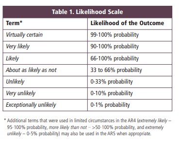 "Les termes suivants servent à indiquer la probabilité d'un résultat : quasiment certain, probabilité de 99–100 %, très probable 90–100 %, probable 66–100 %, à peu près aussi probable qu'improbable 33–66 %, improbable 0–33 %, très improbable 0–10 %, exceptionnellement improbable 0–1 %. Des termes supplémentaires (plus probable qu'improbable >50–100 %, et plus improbable que probable 0–<50 %) peuvent également être employés", décrit le GIEC.