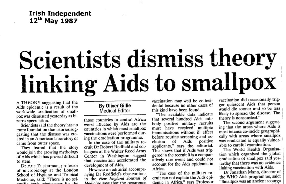 Comme la variole, l'épidémie de sida a durement touché le continent africain. Il n'existe cependant aucune preuve d'un éventuel lien entre la campagne de vaccination antivariolique et le sida. Les jours suivants la publication de l'article du Times partagé sur les réseaux sociaux, plusieurs journaux - dont le Times - ont relayé le démenti apporté par plusieurs scientifiques et l'OMS. Par ailleurs, un médecin interrogé par le journal britannique dans l'article du 11 mai 1987 a assuré à l'AFP que ses propos avaient été "sortis de leur contexte".