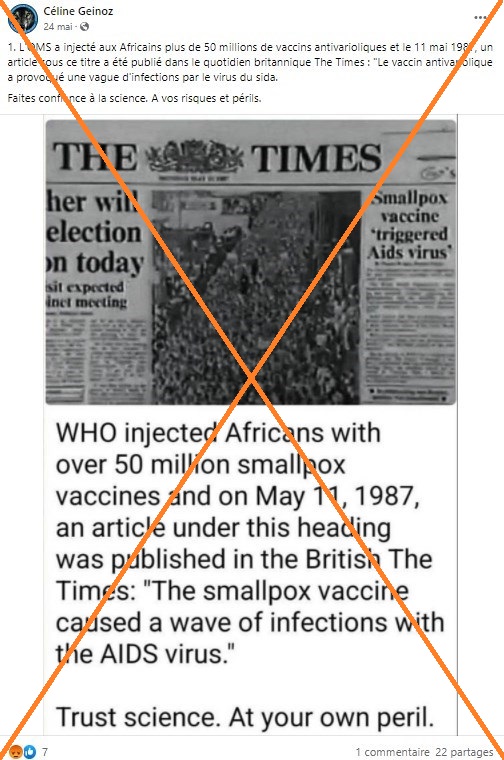 "L'OMS a injecté aux Africains plus de 50 millions de vaccins antivarioliques et le 11 mai 1987, un article sous ce titre a été publié dans le quotidien britannique The Times : "Le vaccin antivariolique a provoqué une vague d'infections par le virus du sida", commente un internaute sur Facebook, déformant au passage le titre de l'article.